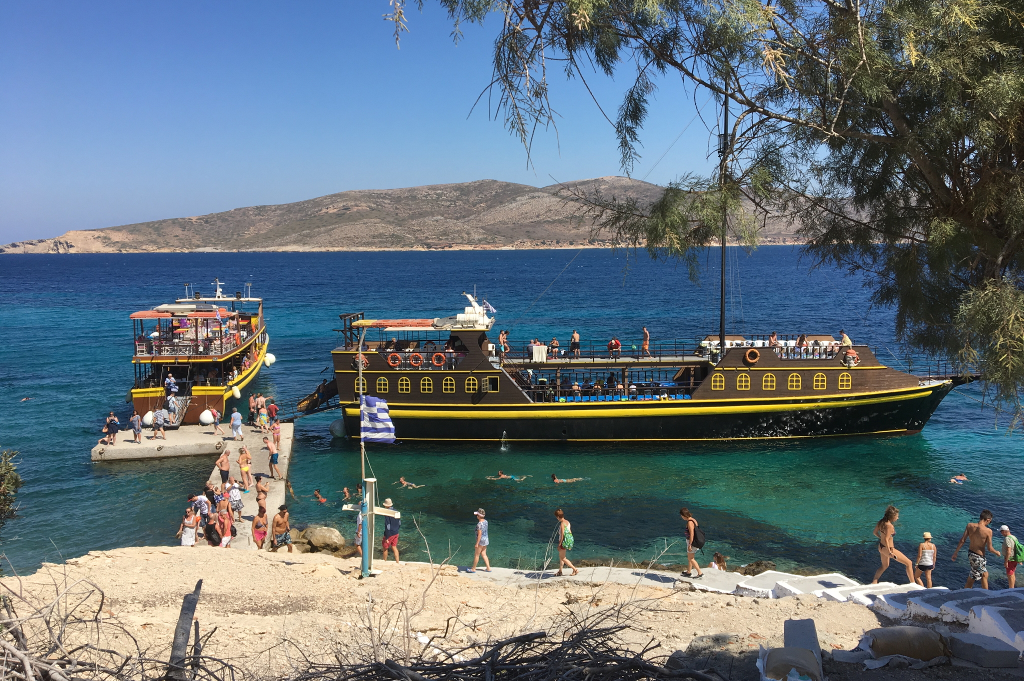 Egy ugrás a hajóról a kristálytiszta Égei-tengerbe. Ez egy rövid megálló, de van elég idő kiúszni a szigetre, amely ma már lakatlan. A sziget keleti oldalán áll az elhagyatott Szent Miklós kápolna.